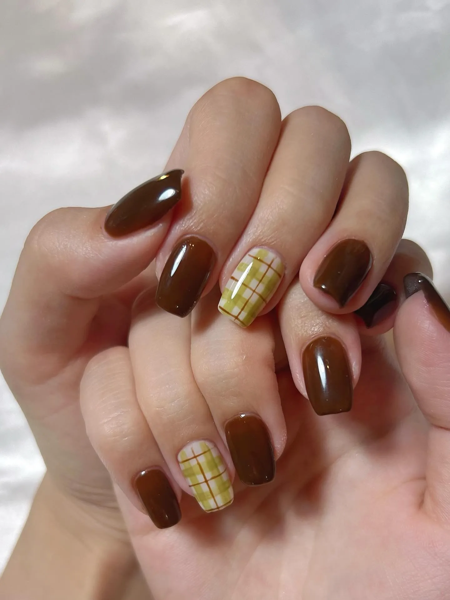 チェック大人気です♪ 2025/10/04 チェック大人気です♪ チェックは少しお時間かかるデザインなので長めに時間をとってご予約お願いします🙇 #秋ネイル#チェックネイル#ブラウンネイル#恵比寿ネイルサロン